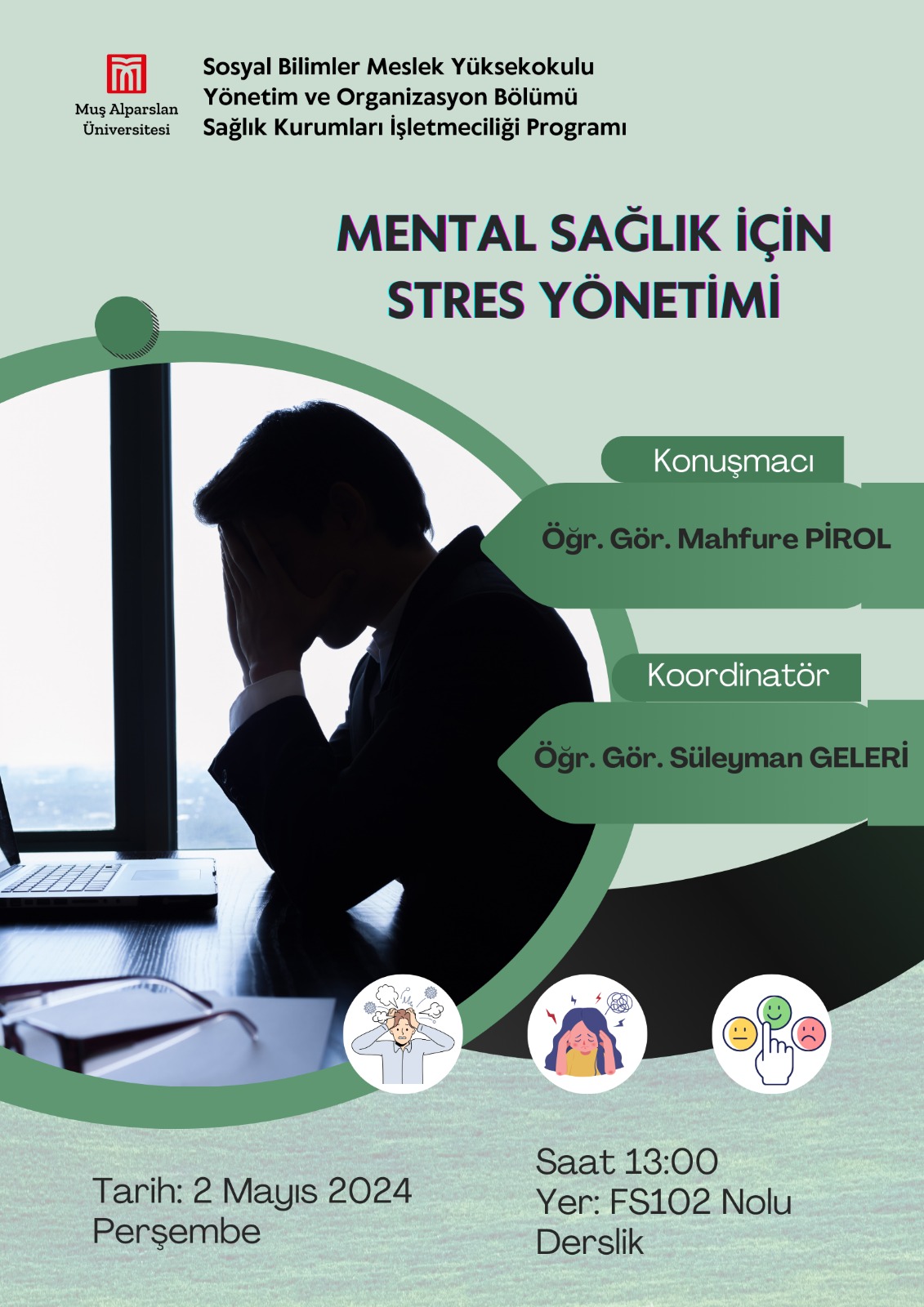 Öğ. Gör. Mahfure PİROL tarafından "Mental Sağlık İçin Stres Yönetimi Semineri" verildi. Öğrencilerimizin yoğun ilgi gösterdiği seminerde günümüzün önemli bir problemi olan stres ve stres ile başetme teknikleri hakkında bilgi verildi.